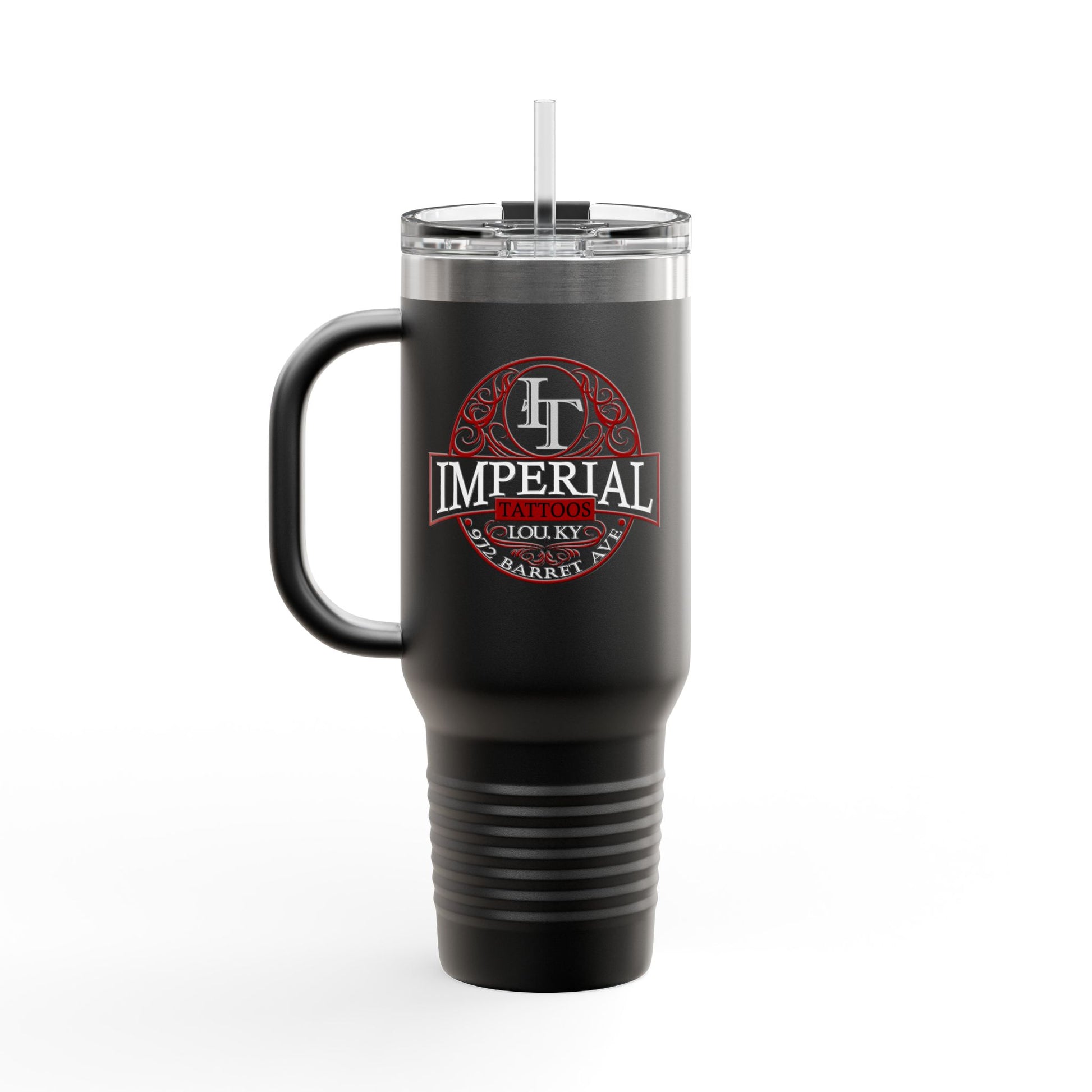 40oz Insulated Travel Mug with 'Imperial Tattoos' Smokers Red Logo — Stainless Steel Tumbler with Straw & Handle