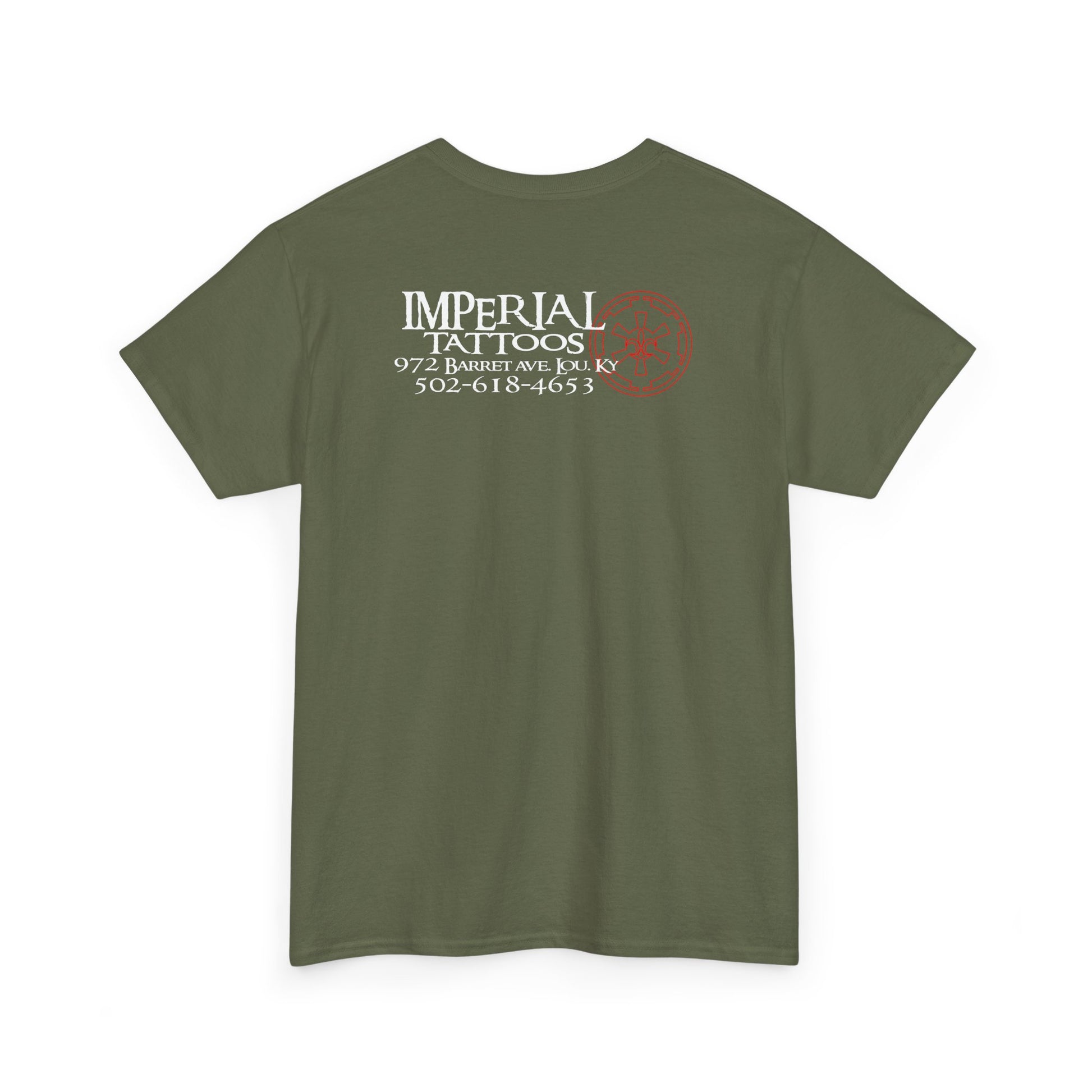 Keywords: Imperial Tattoos Script T-Shirt, Classic Script Design, Elegant Tattoo Apparel, Refined Tattoo Lettering, Black and White Tattoo Tee, Tattoo Studio Merchandise, Traditional Tattoo Style, Modern Tattoo Fashion, Intricate Script Shirt, Stylish Tattoo Wear.