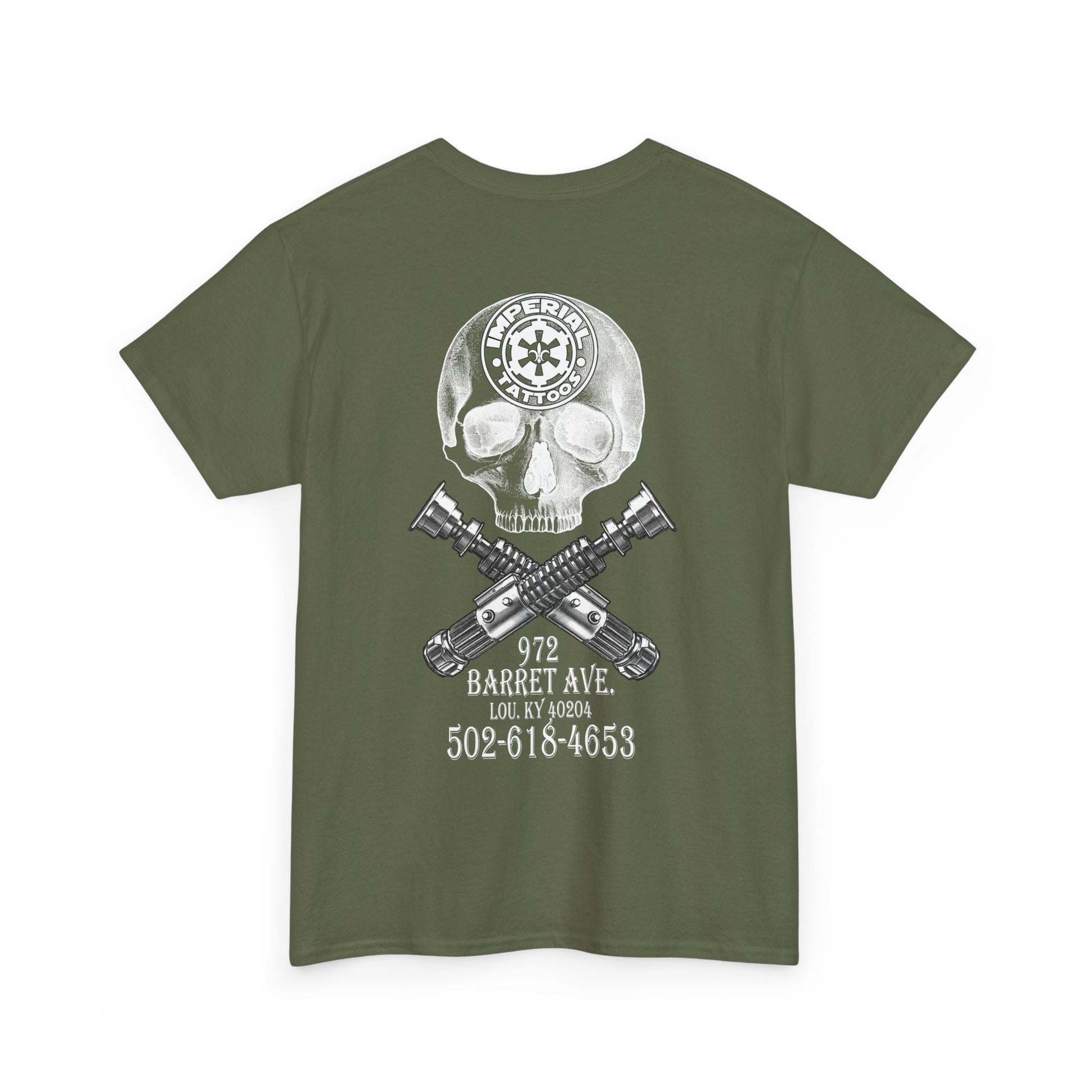 Keywords: Imperial Tattoos T-Shirt, Skull & Sabers Design, Tattoo Shop Tee, Star Wars Tattoo Apparel, Geek Fashion, Tattoo Studio Merch, Bold Back Print, Tattoo Artist Gift, Lightsaber Skull Shirt.