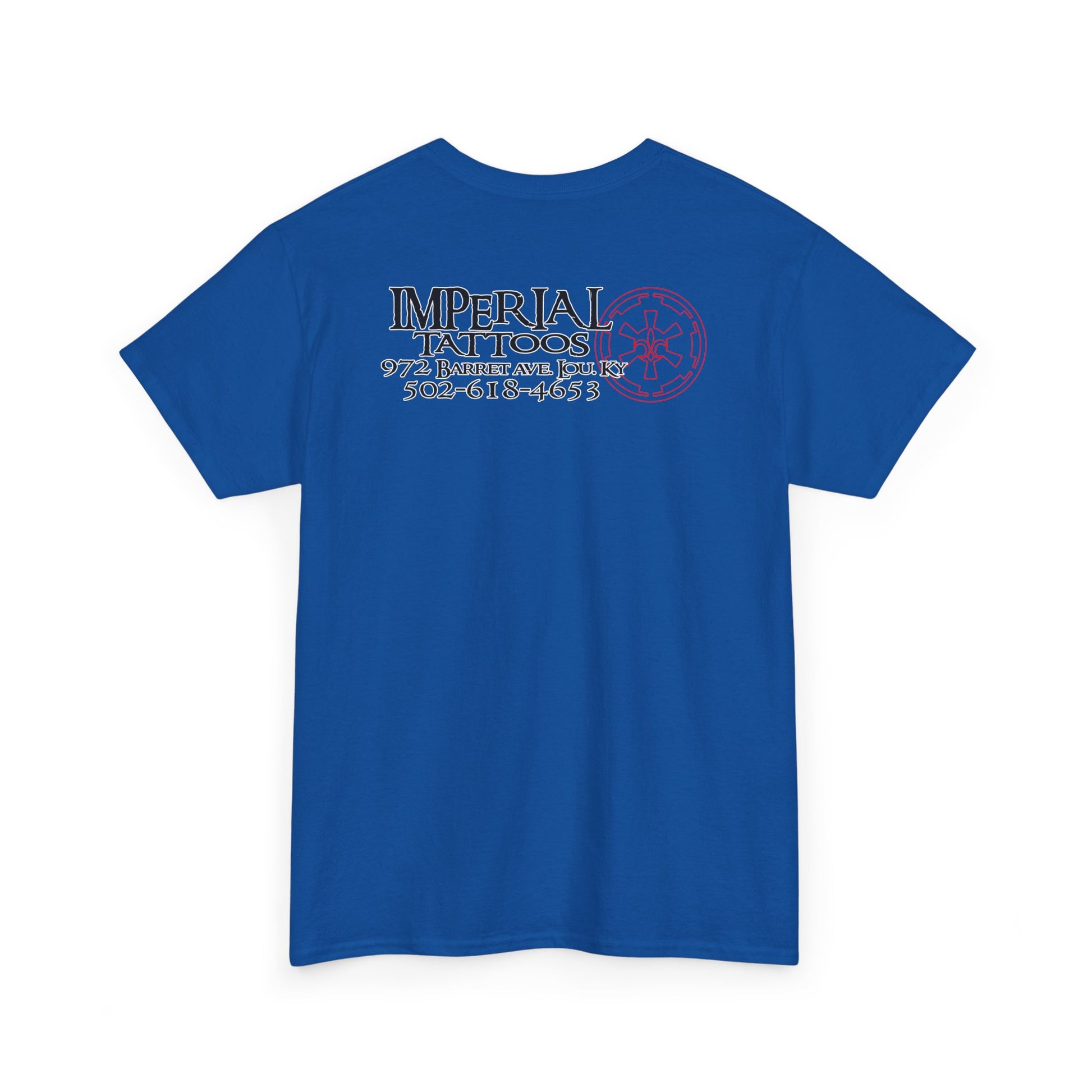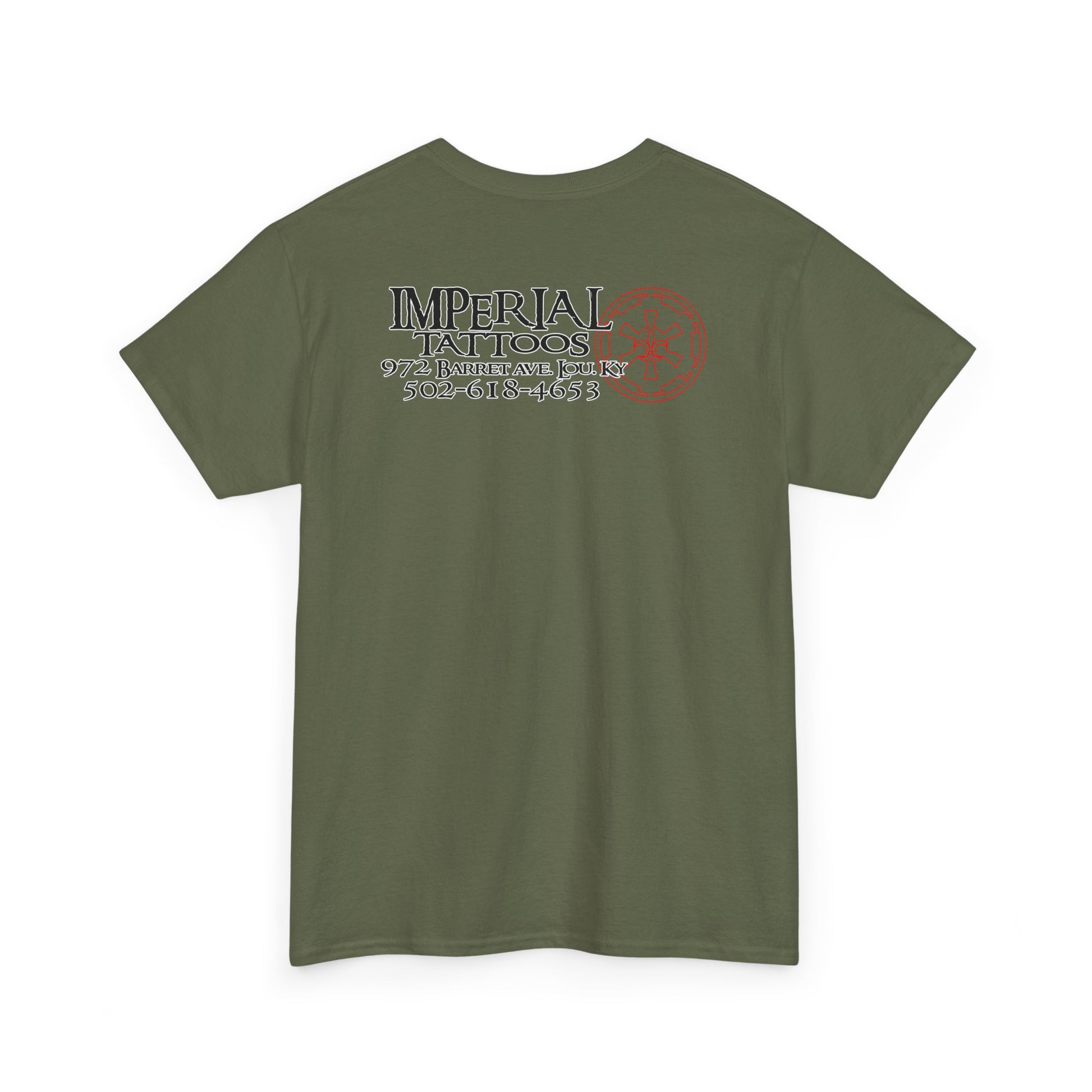 Crafted from soft, durable fabric, this t-shirt offers comfort and longevity, making it perfect for everyday wear or when you want to make a statement at your next event. The gothic script adds a touch of sophistication and mystery, reflecting the depth and detail that goes into every piece of art at Imperial Tattoos.